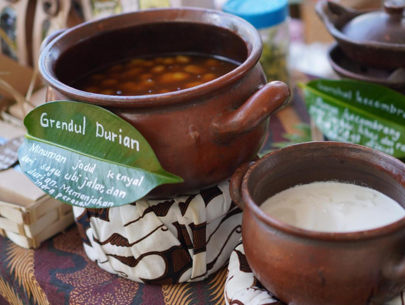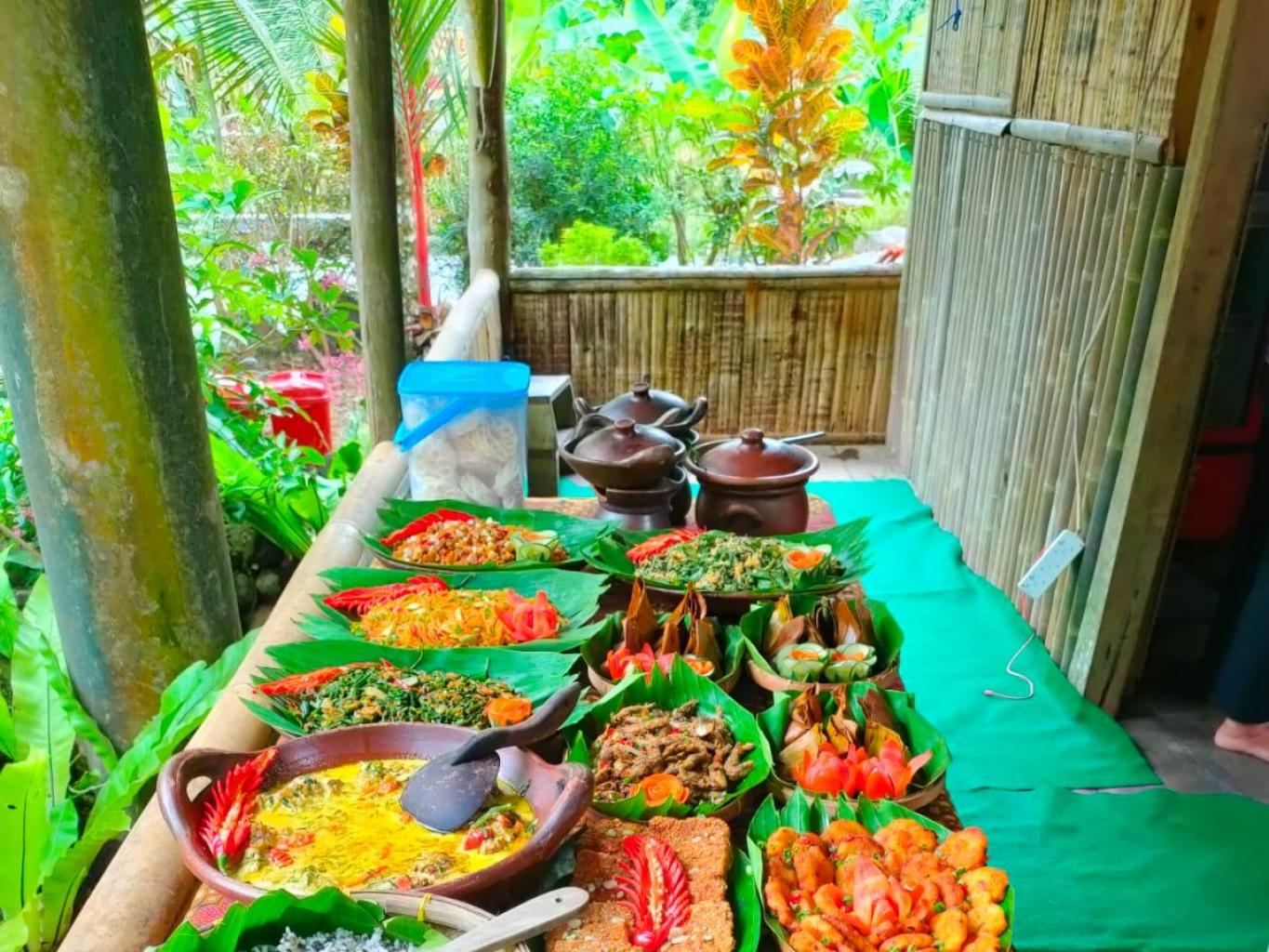 Wisatawan menikmati makanan khas desa seperti nasi thiwul, nasi putih, kare ikan lumedanh/blencing, urap, sayur pakis, sayur lompong, kothok kemangi tahu tempe, gembrot (bothok beluntas), kerupuk, kolak kaling kaling, sop durian, dan snack khas desa.